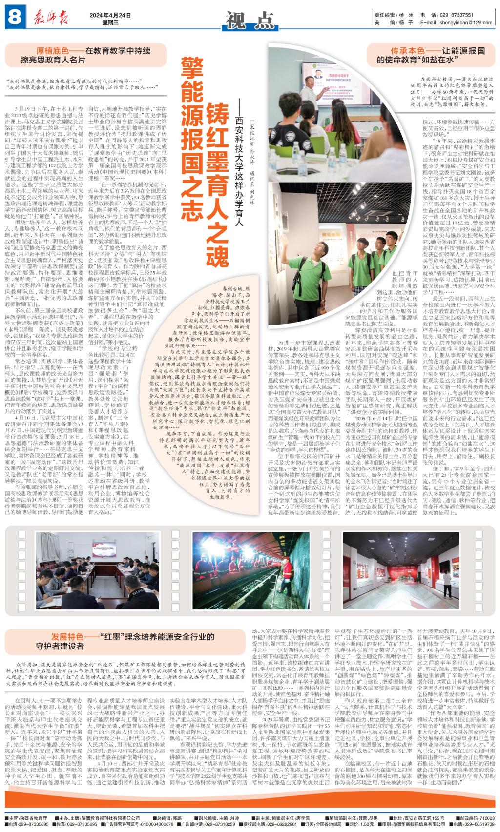 众所周知,煤炭是国家能源安全的“压舱石”,但煤矿工作环境相对艰苦,如何培养学生吃苦耐劳的精神,让他们毕业后愿意去矿山工作并且留得住、能扎根?“在多年的实践探索中,我们总结形成了‘红墨’育人理念。”曹雪梅介绍说,“红”是立德树人底色,“墨”是煤炭特色,把二者结合起来办学育人,聚焦国家重大需求和陕西经济社会发展需要,培养新时代能源安全的守护者和建设者。