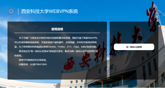 校外访问地址:http://webvpn.xust.edu.cn(为了获得更好的体验建议使用Chrome、Firefox、IE11、Safari等浏览器)。
